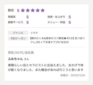 2025年11月26日 / 最終更新日時 : 2025年11月27日 soumu 体が軽くなりました ふみちゃん様 素晴らしい店とセラピストに出会えました、おかげで体が軽くなりました、また機会があれば行こうと思います Facebooktwitter